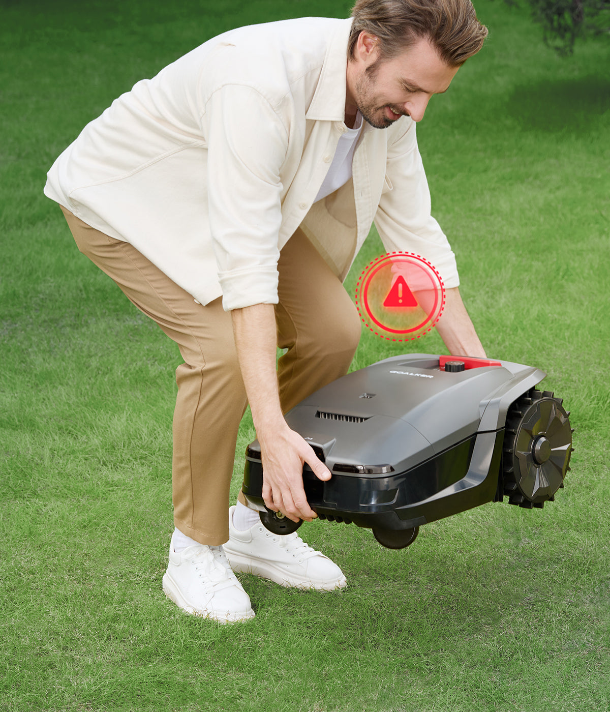 Technical Advisory: Absolutely. Goalker uses AI Vision + Ultrasonic Dual-Obstacle Avoidance. It can detect pets or hedgehogs from 1.5m away and actively reroute. It also features "Lift-to-Stop" and "Tilt-to-Stop" sensors for immediate blade shutdown.